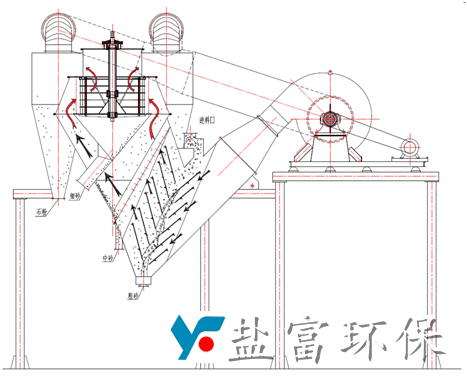 鹽富環保公司生產的YF-SF復合選粉機是將靜態的V型選粉機和內循環高效渦流選粉機有機結合,可分級粒徑為4.75mm甚至 粒徑達10mm以上的物料。來料首先通過靜態的V選進行粗細分離,中砂和細砂隨上升的氣流進入高效渦流選粉機進行分級,石粉則被旋風筒收集。從老式的轉子選粉機只能對機制砂簡單脫粉到實現粗、中、細砂的 分級。